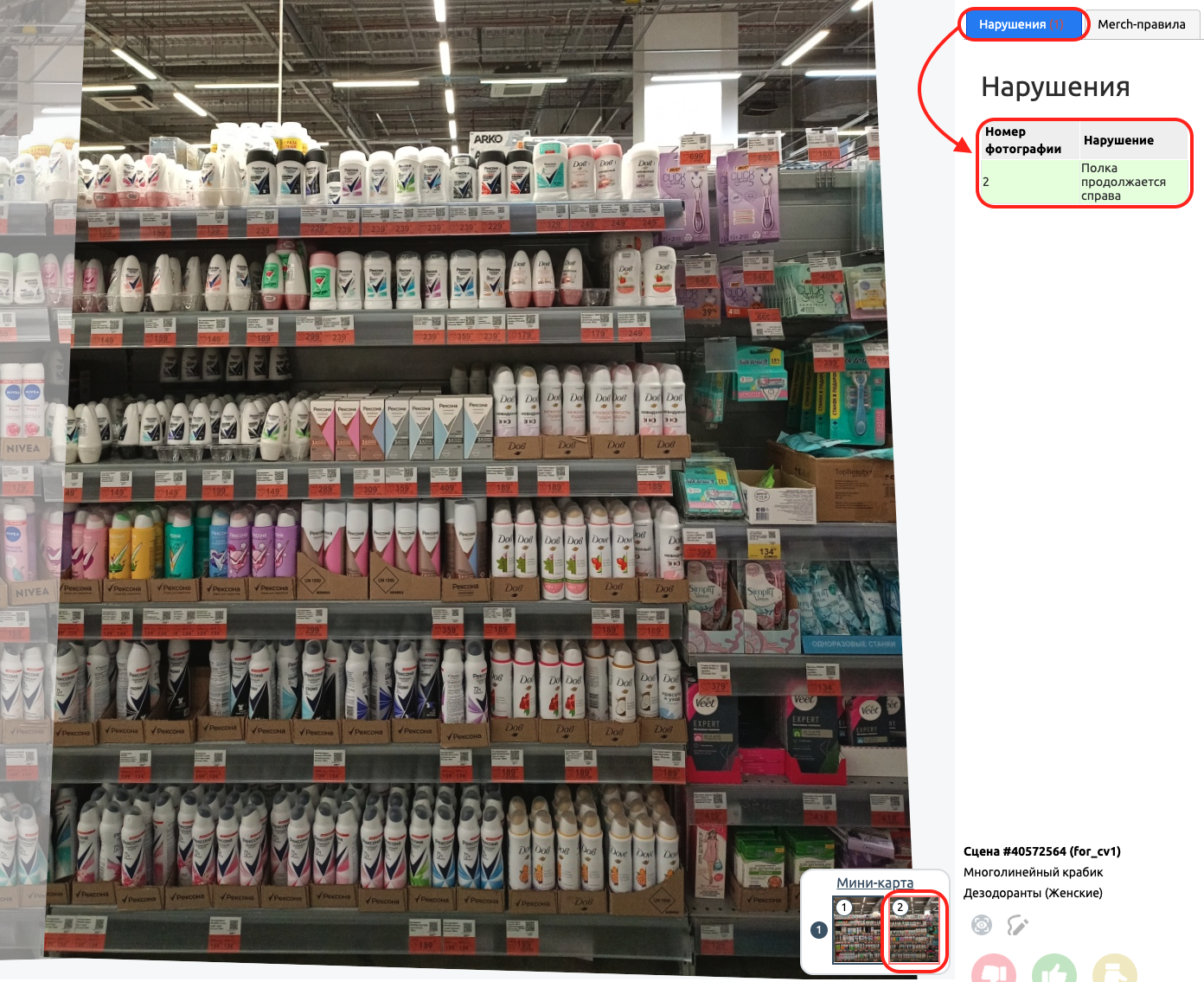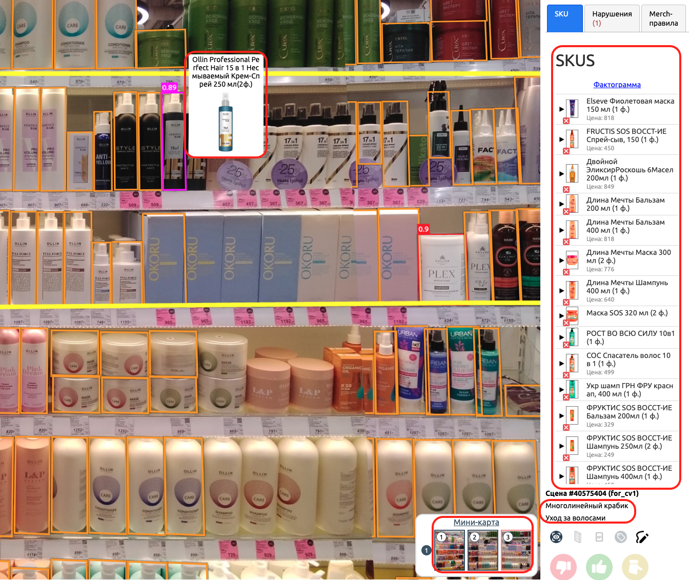 С помощью мини-карты вы можете ознакомиться с каждой фотографией, использованной при склейке сцены. На фотографиях с мини-карты, как и на склеенной сцене, отображаются боксы распознанных товаров и если навестись на бокс, то отобразится изображение, наименование и количество распознанного SKU.