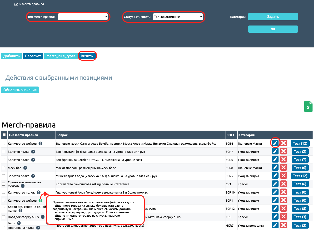 Каждое Merch-правило имеет значок «», при нажатии на него появится блок с информацией о данном МП.