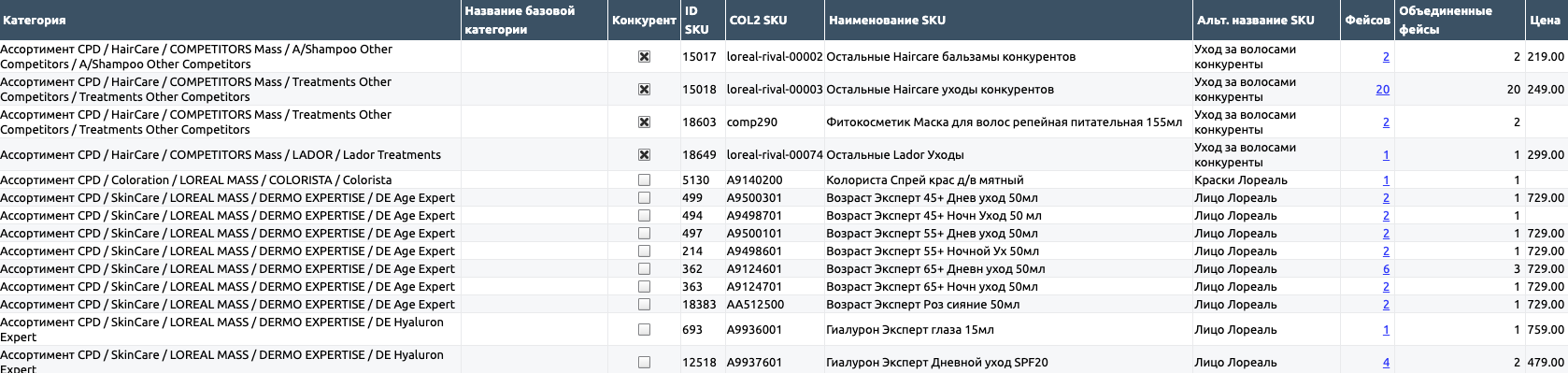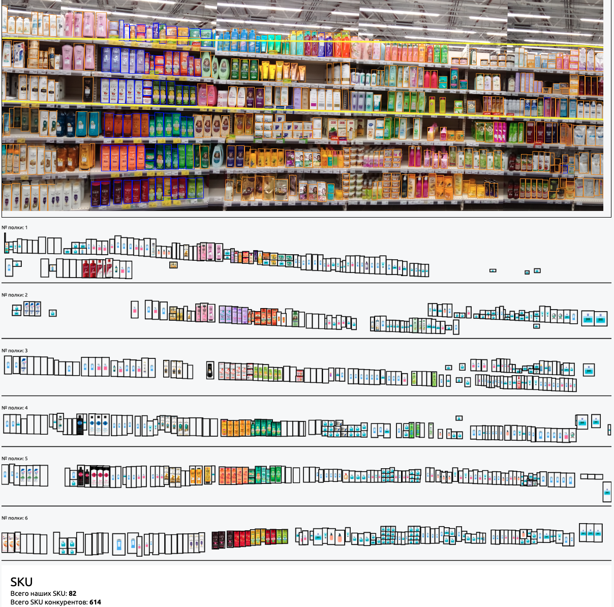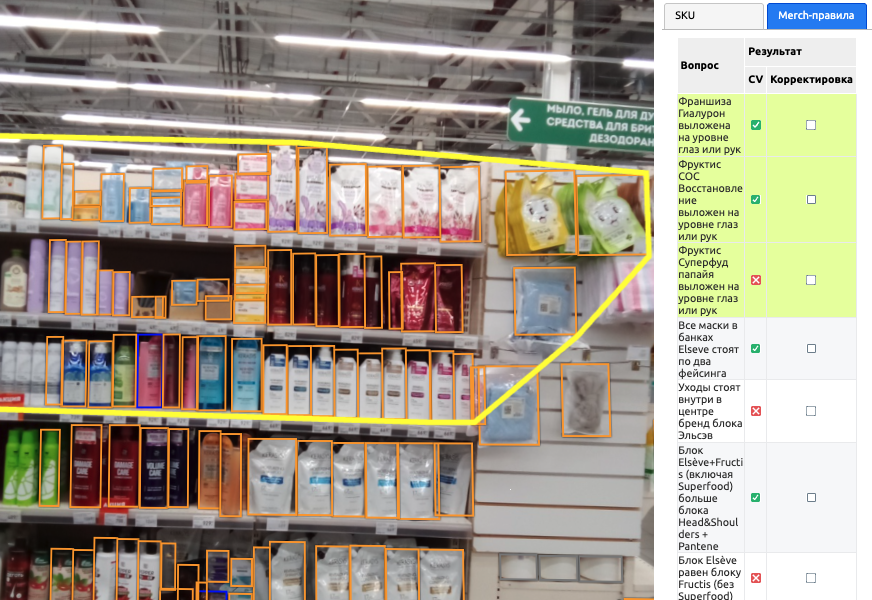 Через SKUS можно перейти к «Фактограмме» - разметке сцены с нумерацией распознанных SKU по полкам.