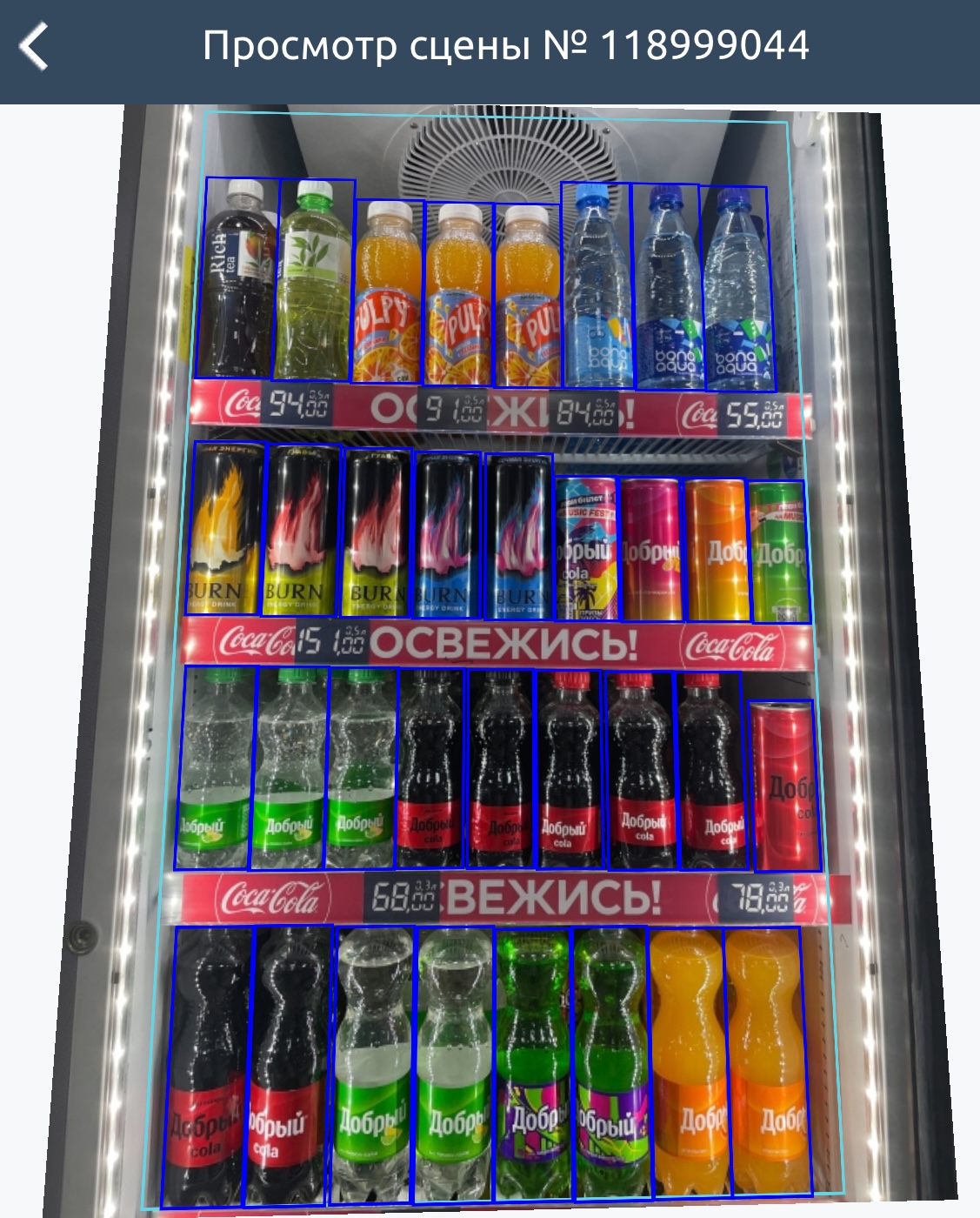При работе со сценой вы можете масштабировать её и просматривать боксы распознанных товаров. Для этого наведите курсор на распознанный товар, чтобы увидеть его изображение, наименование и количество.