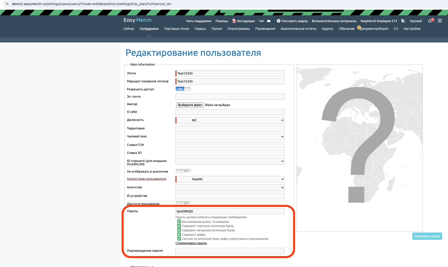 При создании пользователя вы можете либо задать собственный пароль согласно указанным требованиям или же сгенерировать случайный