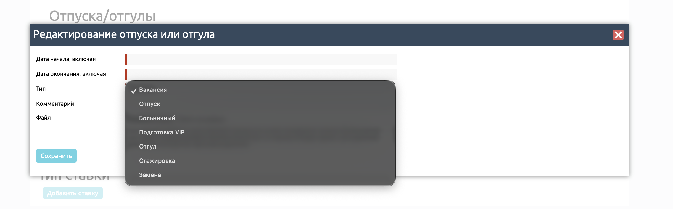 Помимо даты обязательно выберите тип. В зависимости от настроек вашего сервера могут быть доступны разные типы отгулов и отпусков, например: