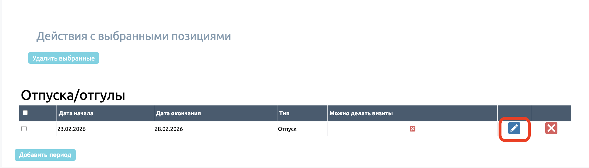 Для редактирования уже существующего отпуска/отгула нажмите на иконку редактирования