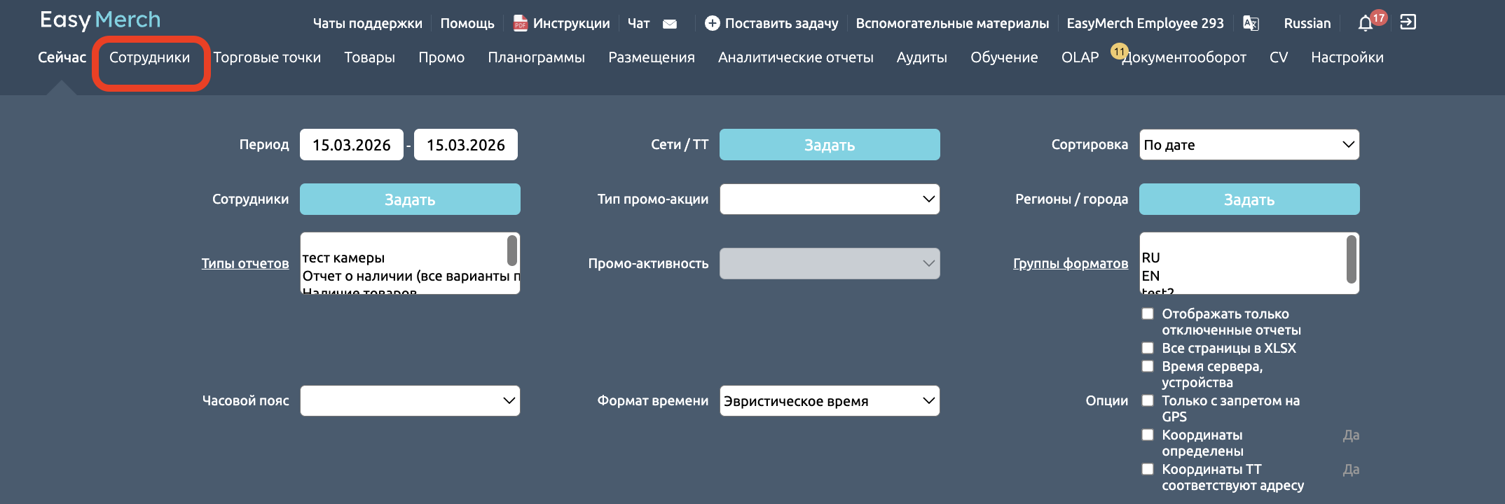 В навигационном меню вверху страницы выберите раздел Сотрудники
