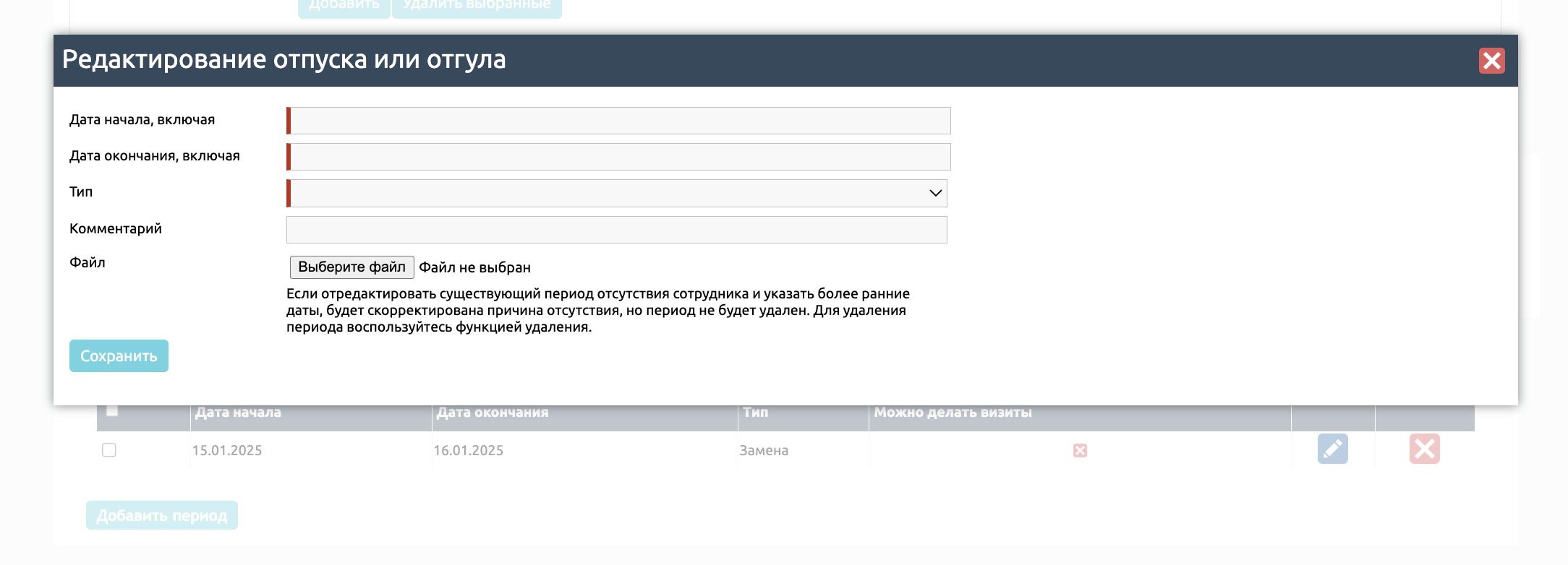 Если отредактировать существующий период отсутствия сотрудника и указать более ранние даты, будет скорректирована причина отсутствия, но период не будет удален. Для удаления периода воспользуйтесь функцией удаления